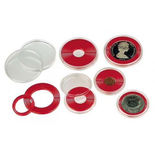 Cápsulas (10) para caixa de moedas. Suporta moedas nos tamanhos 16 a 51 mm. Diâmetro externo - 58 mm. Os anéis que vêm com a cápsula são ajustáveis de forma a acomodar a moeda. Moedas de vários tamanhos podem ser guardadas numa só caixa de moedas. As cápsulas estão disponíveis em vermelho (Ref. 2231) para combinar com os interiores de veludo das caixas para moedas LINDNER, modelo «Standart», Ref. 2212 - 2612.